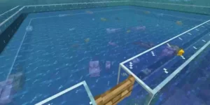 Есть несколько способов постройки бассейна для содержания племенного пула. Например, это может быть большой открытый бассейн (как на скриншоте ниже), в котором все аксолотли будут видны как на ладони. Главная фишка такого бассейна в том, что его можно возвести прямо посреди открытого моря – тогда не придется бегать с ведрами за водой.
